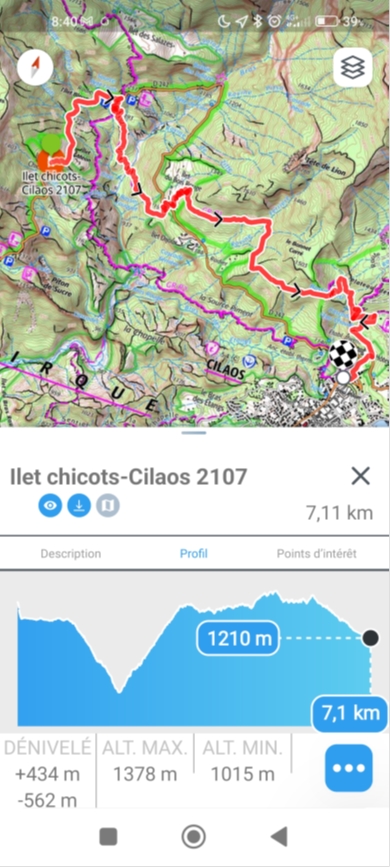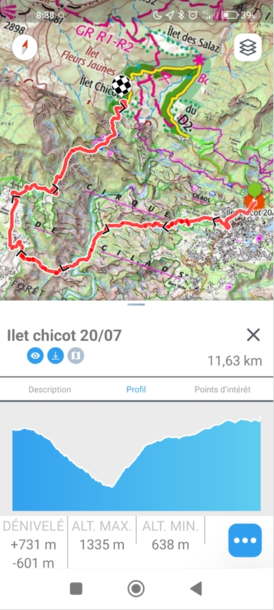 Dimanche 21/07/2024 : dénivelé + 434 m – 562 m / niveau moyen : Ilet Chicots : 1 338 m – Point dans la ravine Bras Rouge : 1 015 m – Le plus haut sommet près du Bassin Bleu : 1 378 m